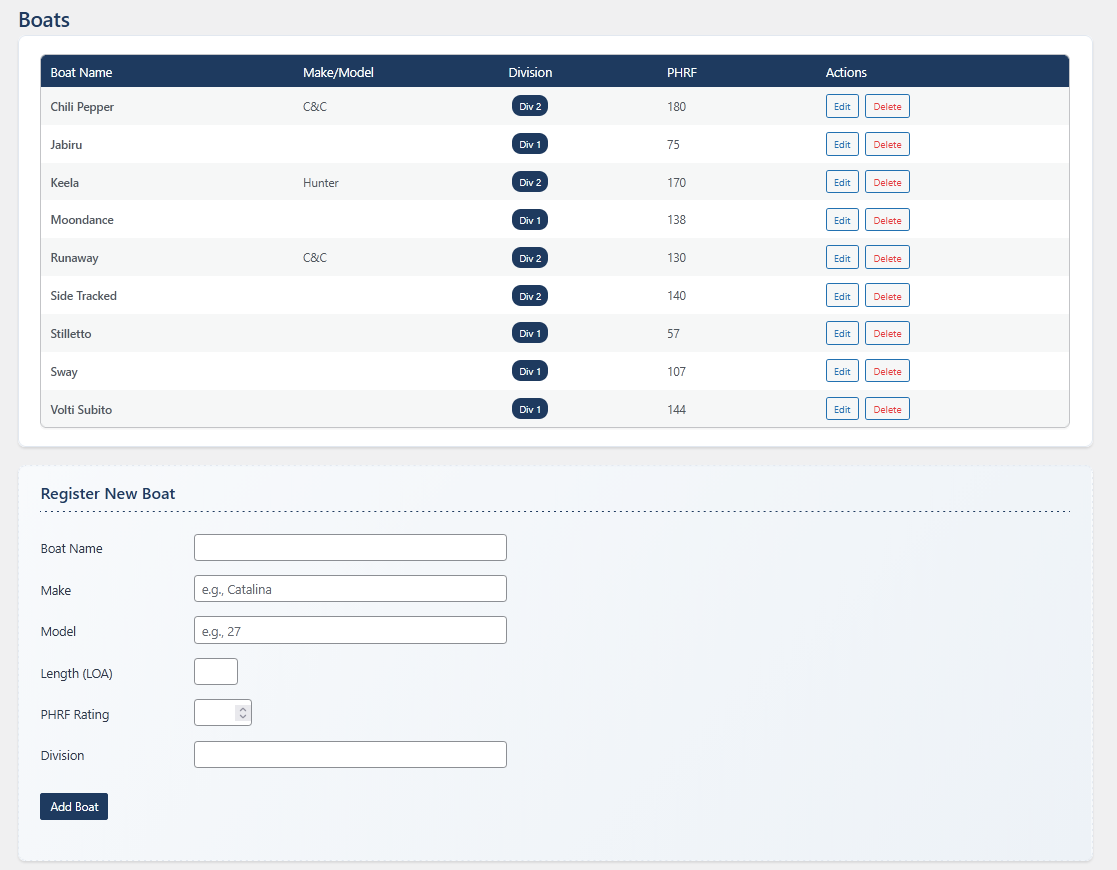 This plugin manages boats, series, races, results, and PHRF handicapping (TOD/TOT). Results are published through a unified public hub, with printable racebooks and CSV exports for transparency and archival use.