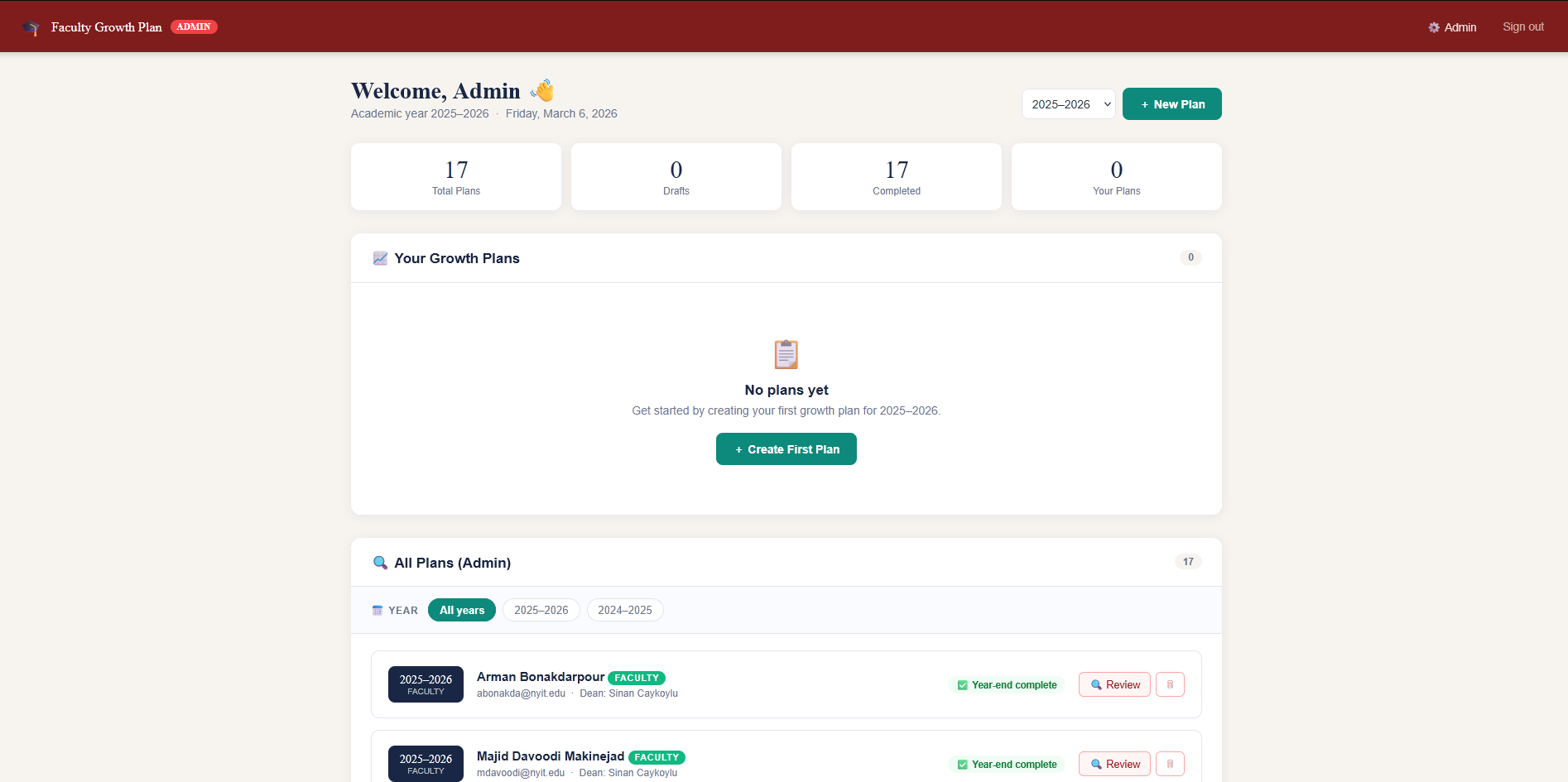 The Faculty Growth Plan Portal is a purpose-built web application that structures the entire faculty goal-setting and review lifecycle in one place. It has three stages, each designed to create a different kind of conversation.