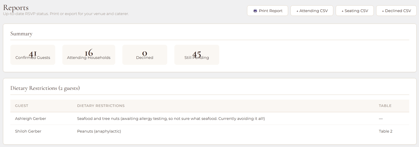 A printable summary of attendance figures, dietary breakdowns, pending households, and any failed email deliveries that need attention.